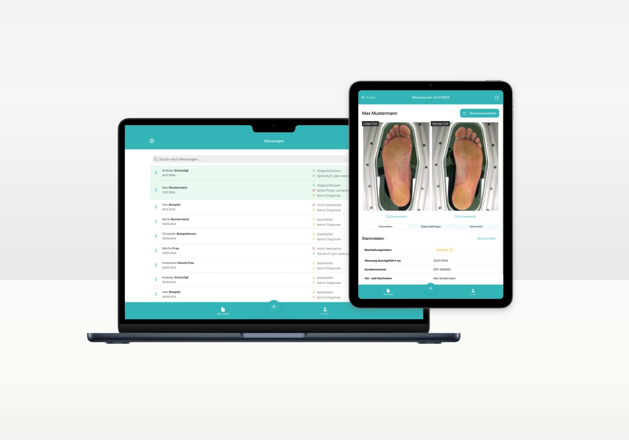 Die Orthofuß iPad- & Web-App in Kombination mit der Messstation hilft Orthopäden beim Scannen und Analysieren von Fußsohlen.